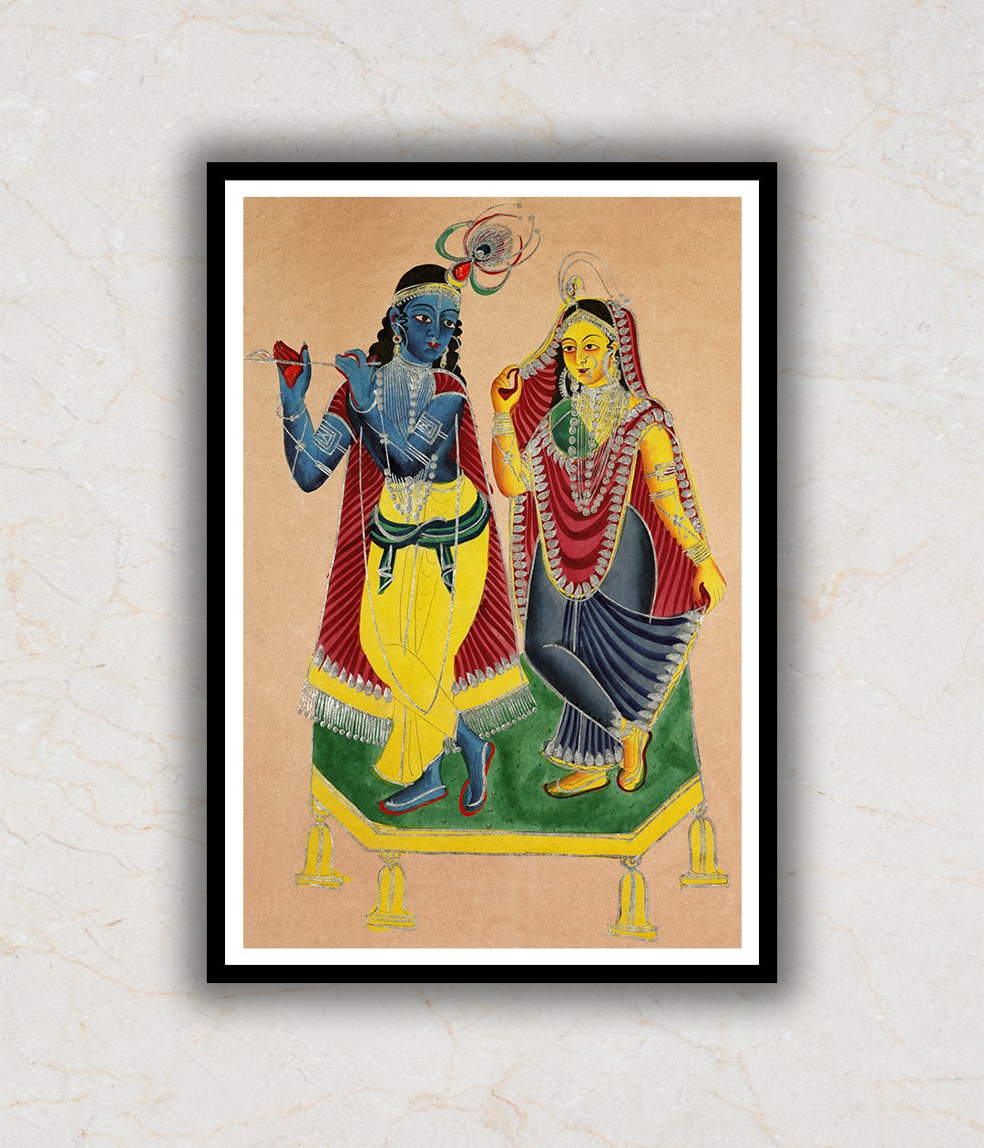 DESCRIPTION: Kalighat paintings were originally meant to be religious souvenirs and over time it developed into a full-fledged art form. Depicted here, is the figure of Lord Krishna with Radha in neat and clean colors. The background, like a traditional Kalighat painting, has been left untouched but given the godliness behind...